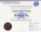 With Jackie's day-to-day utilization of the lift, improvements were made to make the unit more user friendly and the second generation design was completed in 1998. This unit received the Wisconsin Governor's New Product Award that same year. The lift ramp was test marketed at the 1998 Atlanta Medtrade Show and received outstanding dealer acceptance. Since then, a third generation design program has been undertaken with an objective to reduce manufacturing costs. This third generation unit is the Lift Ramp we are currently marketing to the public. In September of 1999, a United States Patent was granted to Raase Lifts, Inc.
